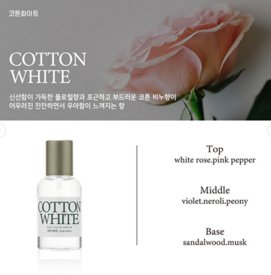 📌Cotton White: tone mùi tinh khiết, nhẹ nhàng thanh lịch, hoa hồng trắng, phấn, có chút man mát của hoa cam