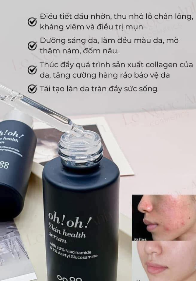 ❤ Tinh chất oh!oh! Skin Health Serum chứa các hoạt chất điều trị mạnh mẽ với “công thức” 20% Niacinamide (Vitamin B3) và 2% Acetyl Glucosamine cũng như Arginine, Allantoin, chiết xuất hoa Cúc Đức, chiết xuất lá Rosemary,… đạt hiệu quả vượt trội: